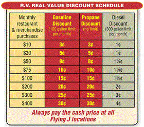 For many years, Flying J Travel Plazas have been offering holders of the Flying J R.V. Real Value Card a penny discount on the purchase of gasoline and diesel fuel. The Flying J R.V. Real Value Card also entitled you to a 5-cent-per-gallon discount on all propane purchases. Customers had the opportunity to receive bigger discounts as well based upon monthly non-fuel purchases; however, the discount never exceeded 2.5 cents per gallon under the old program.