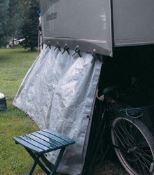 We devised a storage area for our bikes, camping chairs, tables, etc., outside the motorhome by attaching a tarp to the underside of the bedroom slideout using large clamps, and anchoring the bottom with tent stakes and bungee cords. This provides shelter from the elements, and it’s very easy to assemble/disassemble and store.