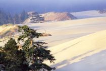 Sand mounds lift 500 feet skyward in some places, anchored by vegetation. Elsewhere, dead trees litter the wakes of walking sand dunes — mounds that shift location as the wind moves. Each rise delivers views. Tree islands and at least 30 freshwater ponds and lakes punctuate the undulating, patterned expanse. The open sands, upland forest, sand-trapped pools, marsh lowlands, and ocean shore create a rich mosaic for deer, beavers, sea lions, bald eagles, ravens, great blue herons, snowy plovers, and other creatures. Fog and the sun’s changing angles transform the setting.