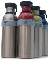The 1-liter bottle’s screw-off upper half also provides access for cleaning and for filling the bottle with ice. When separated, the bottom portion can be used as a drinking cup and the top as a wine-glass-size goblet. Each bottle features a screw cap top; a recessed flip-up hanging ring; a glow-in-the-dark accent; and a convenient cap lanyard.