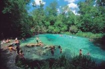 Finally, another National Natural Landmark is located farther west of River Rise via U.S. 27: Ichetucknee Springs State Park (386-497-4690). Situated near Fort White, this park is said to have the nation’s most pristine river, with tubing, kayaking, and canoeing available. The crystalline Ichetucknee River flows six miles through shaded hammocks and wetlands before it joins the Santa Fe River. Tubing down the river is the premier activity in the summer, and from October through March, scuba divers plunge into the Blue Hole (cave certification is required). Tubes and snorkeling and diving equipment can be rented from private vendors outside the park.