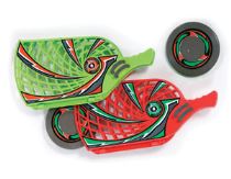 The kit comes with two colorful toss-and-catch launchers and two ultra-glide flying discs. The Skywinders are said to open and close easily for fast catch-and-release action.