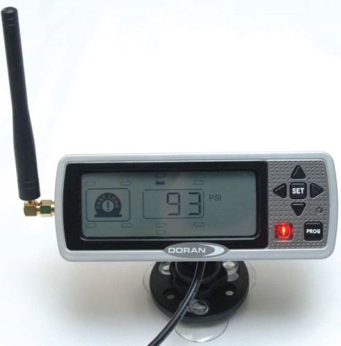 The Doran 360RV tire pressure monitoring system features a monitor with a backlit display for better visibility. The display can be customized to fit a particular motorhome and towed car setup, and it operates via a 12-volt adapter. Multiple options are provided for mounting the system on the dash or on a sun visor. A “Green Means Good” LED indicator light provides confidence that the system is working as programmed.