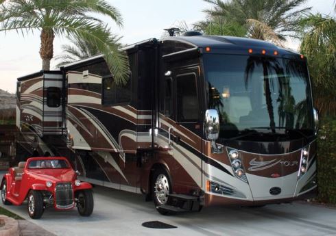 If you’re a full-timer, or are considering becoming one, you’ll want to take a look at the 2012 Winnebago Tour lineup. Its three floor plan choices consist of the 42AD (four slideouts with a wide-open front galley), the 42QD (three slideouts with a full-wall slideout on the driver’s side, a midcoach half bathroom, and an L-shaped extendable sectional sofa), and the 42JD (three slideouts with a full-wall version on the driver’s side, a midcoach half bathroom, a master bath with two sinks, dual living room TVs, and a pair of facing sofa beds).