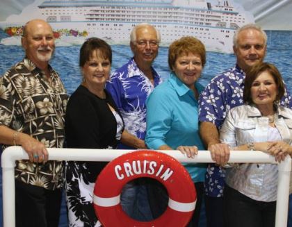 Cruise directors (from left to right) Bob and Janet Romain, Bob and Viv Ours, and Ed and Susan Broussard helped create an oceanliner experience for attendees at the Cruisin' Cajuns chapter's Cruising the Seas rally.
