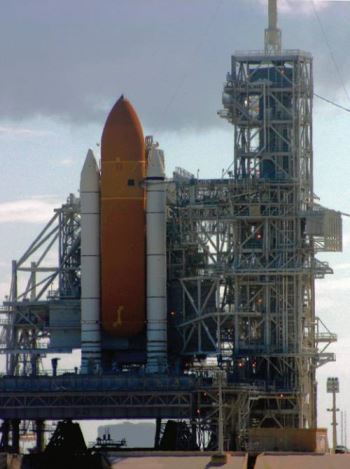 Barely visible 12 miles across the Indian River from Titusville, Florida, is the shuttle’s Vehicle Assembly Building. This structure housed and protected the shuttle while it was being prepared for the next launch. The Vehicle Assembly Building is 525 feet tall and encompasses 8 acres; it is the third largest building in the world. It had to be immense to accommodate the 184-foot-tall space shuttle.