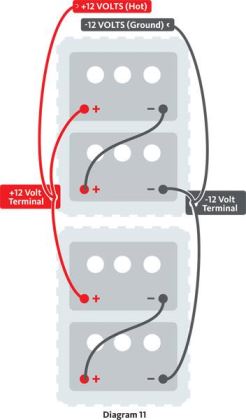 This diagram depicts the use of a dedicated positive and negative terminal to balance the battery banks.