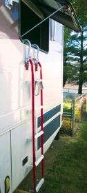 5. Open the emergency exit and place a prop between the window and sill to hold it open. (I use a 24-inch-long venetian blind turner rod for this purpose. It should be stored in the same vicinity as the ladder to ensure that it will be available if needed for an emergency escape.) While setting up the RV escape ladder and practicing egress, place a blanket or towel over the window sill and down the outside of the RV to prevent damage to your motorhome.