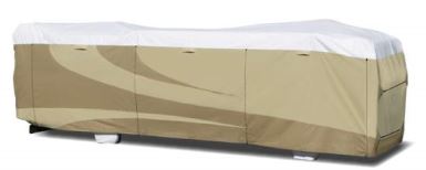 The company’s top-of-the-line covers are made of Sunbrella RV fabric. These custom-fit covers are recommended for use in any climate and are available for Type A and Type C coaches. The Sunbrella covers are said to be especially effective in dusty environments, and to provide excellent protection against strong sunshine, intense UV rays, and high moisture. Sunbrella fabric is solution-dyed, meaning the color is placed into the fibers as they are extruded. Therefore, sun, wind, and rain will not diminish the color intensity. In addition, Sunbrella is made out of acrylic, so it resists mildew and won’t harden or crack. These covers are available in tan or gray and have a five-year warranty.