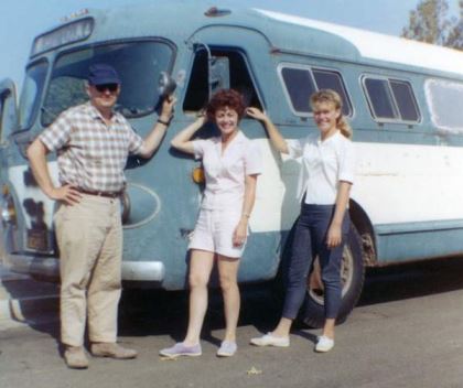 Bruce and Mary Johnston and their daughter Claudia, charter members of the California chapter, pose with their Flxible bus conversion.