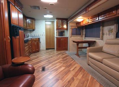 It’s not uncommon for an RV owner to totally remodel his or her coach interior with new flooring, new cabinetry, MCD shades, and new furniture. Corian countertops and tile backsplashes also are offered. Fabrics are available for purchase by the yard, including solid colors, prints, Ultraleather, and Haloleather.