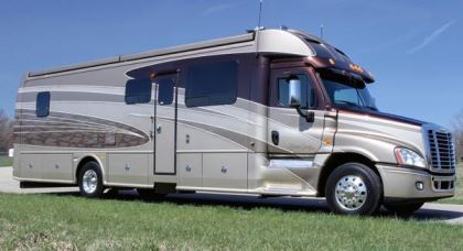A Freightliner Cascadia chassis is the base for the Grand Sport GT Super C motorhome from Dynamax