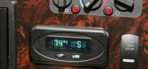 Many newer cars and trucks have a small window within the rearview mirror that displays compass and temperature information. That works well for a car or light truck, but motorhomes typically don’t have a rear window, or if they do, it’s back in the bedroom. Some coaches still use a mirror-type system, which can be beneficial for monitoring passengers. But the temperature display in a rearview mirror is quite small and hard to see from the copilot’s seat. Plus, it’s powered by the ignition circuit, so it isn’t active when the coach is parked.
