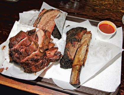 The restaurant is especially known for brisket, which can be ordered moist, dry, or as burnt ends. A fire in the limestone pit is fueled by live oak wood rather than mesquite, which some say can leave a bitter taste. Once the meat is seared, it is moved away from the hottest part of the fire. Brisket is slow-cooked for 20 to 24 hours to ensure maximum flavor and tenderness.
