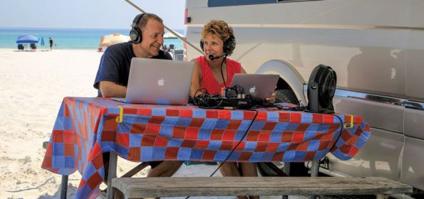 Technology allows Mike and Jennifer Wendland to record and share their weekly podcast no matter where they roam, including this beach in Florida.