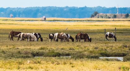 Continuing east on Route 175, you arrive at Chincoteague, Virginia. This has been a vacation destination for many years, but it received its greatest fame with the publication of the children’s novel Misty of Chincoteague in 1947. A number of festivals are held here throughout the year, but the best known is the “Pony Penning” in July. At low tide, horseback-riding “saltwater cowboys” from the fire department herd wild ponies from Assateague Island across to Chincoteague Island. Some of the foals are auctioned off to provide funds for the fire department, and the adults are herded back to Assateague for another year.