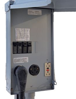 A typical campground pedestal, with 50-amp, 30-amp, and 20-amp circuits. Unreliable campground power can damage an RV’s electrical system.