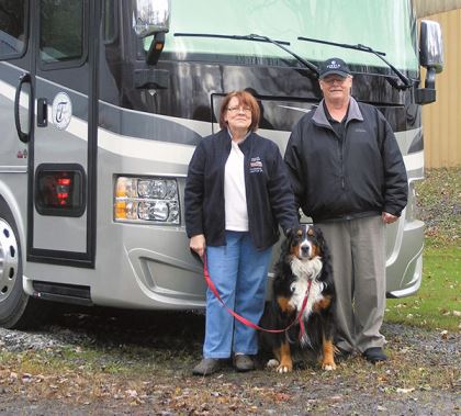The Johnsons travel with their Bernese mountain dog, Hollie, in their Tiffin Type A motorhome.