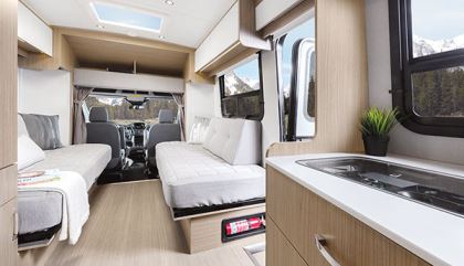Leisure Travel Vans has introduced the Wonder Front Twin Bed (FTB) motorhome for 2018. The twin beds can slide together to form a single bed measuring 64 inches by 76 inches, which is four inches wider than a residential queen-size bed. The motorhome is built on the Ford Transit cutaway chassis, powered by a 3.2-liter Power Stroke turbo-diesel engine. Other highlights of the Wonder FTB include: