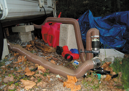When the holding tanks are reversed, each tank outlet faces the passenger side of the RV. An electric gate valve is attached directly to each tank outlet, which is the optimum location for the dump valves. All utilities must be positioned at the rear of the driver’s side (street side) of the RV. Therefore, an additional “Y” fitting couples the two tank outlets and connects directly to an extra-long, flexible sewer hose that transverses the width of the coach and ultimately terminates on the street (driver’s) side. There, the hose typically is stored in a protective tube.