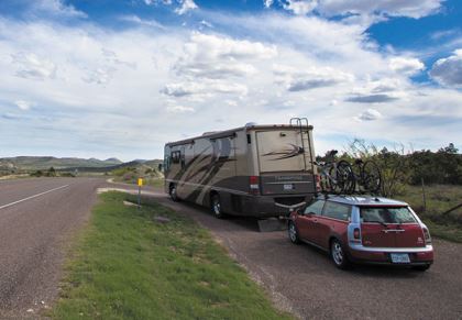 The fridge falling wasn’t the only thing we’ve seen happening behind us. During our first trip to the Florida Keys, we were towing our little Mini Cooper behind our motorhome. We had stopped for lunch and were headed back out on the road. We turned out of the parking lot and started to feel the RV shaking. As we glanced around, Brandon’s eyes fell on the screen for the rearview camera, and I saw them widen. I looked at the screen and saw the Mini bouncing from the tires on the passenger side to the tires on the driver side. It was going back and forth, bouncing one way and then the other. We already were driving slowly, but we slowed almost to a dead stop to let the car regain its footing before we continued to where we could pull off and check it for damage. Evidently, the tires caught the edge of the asphalt as we turned out, and it sent the car into a side-to-side bounce. A Mini may be small, but it was still shocking/amazing/crazy to see it bounce like that.