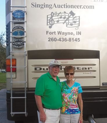Dane and Christina Bailey travel in their Newmar Dutch Star motorhome, which proclaims him “The Singing Auctioneer.”