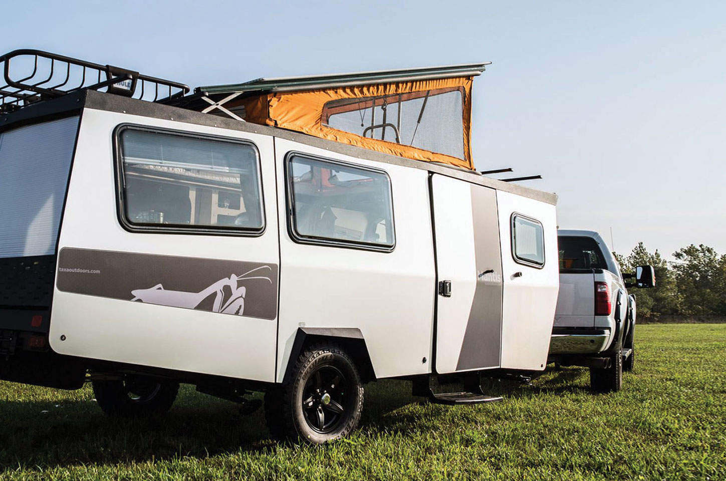 Taxa Outdoors Inc.’s newest travel trailer is the 18-foot Mantis. The RV sleeps up to four adults and weighs 2,800 pounds (unloaded). The trailer folds down to a height of 6 feet 9 inches so that it can be stored in a garage of standard length and height. It comes with 30-inch, all-terrain tires.
