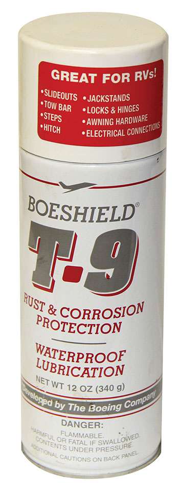 Boeshield T-9 cleans, lubricates, and protects. It attacks corrosion, loosens rusty parts, and flushes out old lubricants. This lubricant leaves a dry, waterproof film that won’t wash off in rain or mud. It will not harm plastic, rubber, fiberglass, or vinyl and is safe to use on electronics. It’s available in liquid form or in a spray can. Boeshield T-9 is an excellent choice for awning hardware, slideouts, tow bars, hitches, or any kind of linkage. I’ve found it to be a great cleaner/lubricant for folding and slideout steps, which tend to collect water and dirt and seize up fairly quickly. After a good cleaning and a shot of Boeshield T-9, they are as good as new.