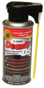 DeoxIT is available in various forms, such as wipes, pens, liquid, or spray cans. My favorite is the 5-ounce spray can with the flip-up nozzle. DeoxIT protects the trailer lighting umbilical between our motorhome and Jeep, and it also eliminates noise and crackle on my electric guitar cords. It’s a great product for any metal electrical connection. It’s safe to use on plastic.