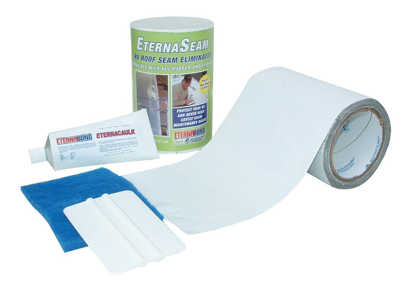 EternaBond is available in various widths and lengths, including roof kits. The most popular sizes are the 2-inch-wide and 4-inch-wide repair rolls, but 50-foot-long rolls are available in widths up to 48 inches to cover slideouts or other large areas. Once EternaBond tape is installed, you can forget about it.