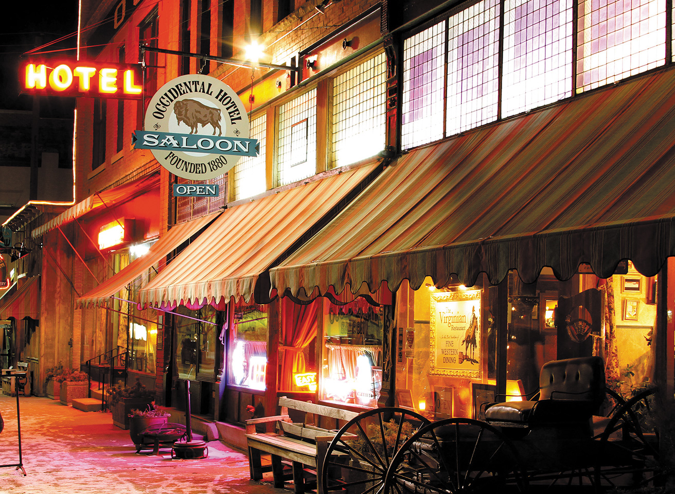 The old Occidental Hotel, built in 1880, remains open for business. Originally, this fine establishment was known for its gracious hospitality and fine dining, and it still is. The list of previous guests is long and storied: Buffalo Bill Cody, Calamity Jane, Theodore Roosevelt, Butch Cassidy, Ernest Hemingway, and others.