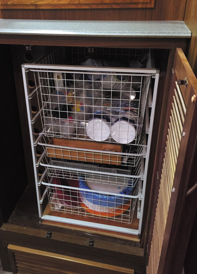 Our 2005 Fleetwood Excursion motorhome came with a washer/dryer combination, which we never used. What we needed was more space to store things, such as paper plates, cups, etc. Our solution was to remove the washer/dryer, which we sold, and replace it with a built-in storage rack. Such racks are available at home-improvement stores and come in various sizes. The installation was easy. Another benefit: The net weight reduction was about 100 pounds.