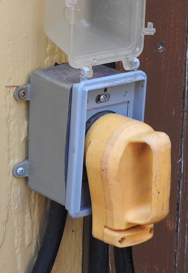 When installing either 30-amp or 50-amp receptacles, the electrician should mount it with the ground (round) hole up, just like at RV pedestals. This allows the shore cord to go downward when connected. Not all contractors are familiar with RV wiring requirements.