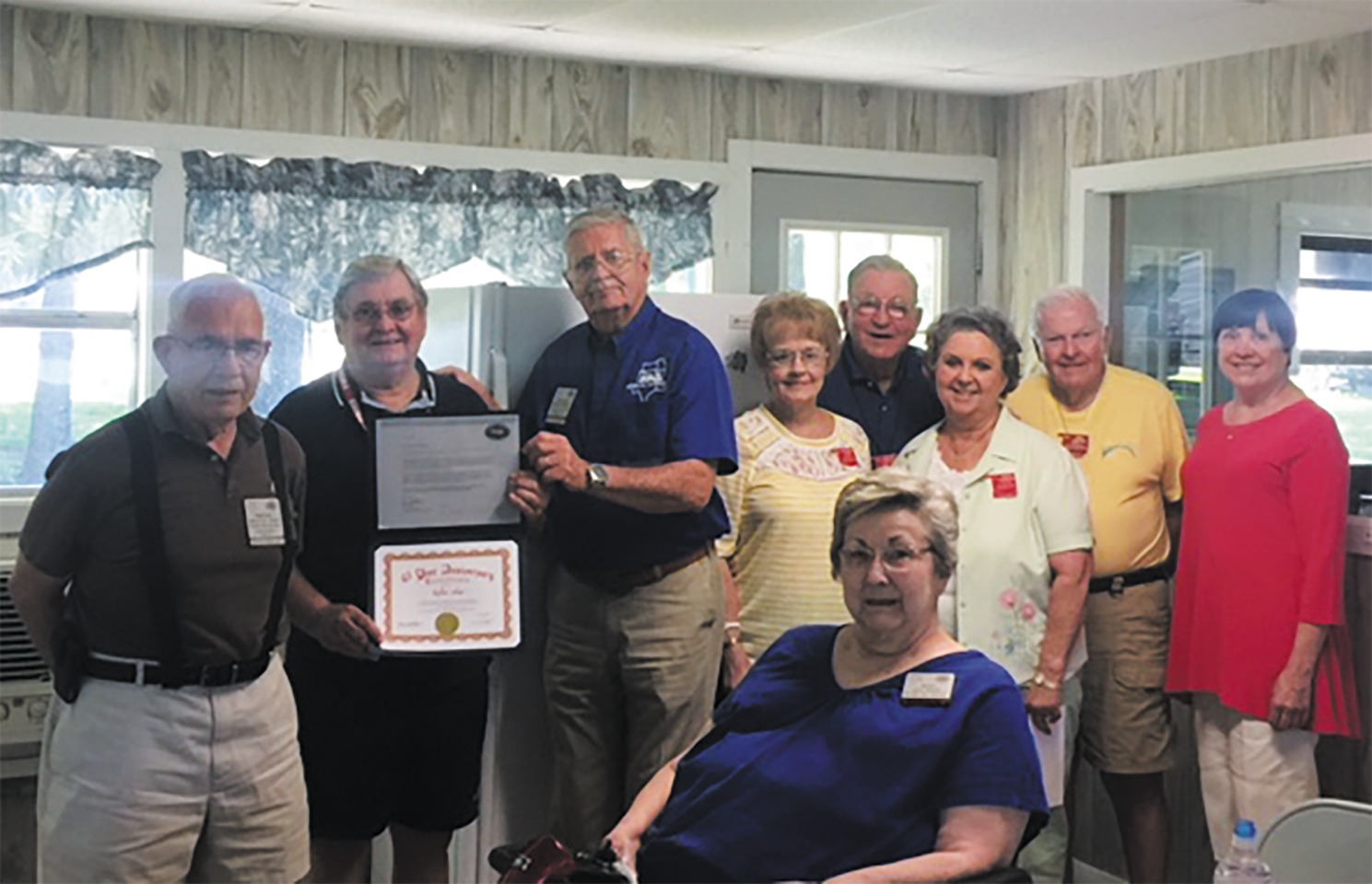Herman Mullins, senior vice president of the South Central Area's Six State Rally Association, third from left, presented Rollin' Okies members with a certificate in honor of the chapter's 45th anniversary.