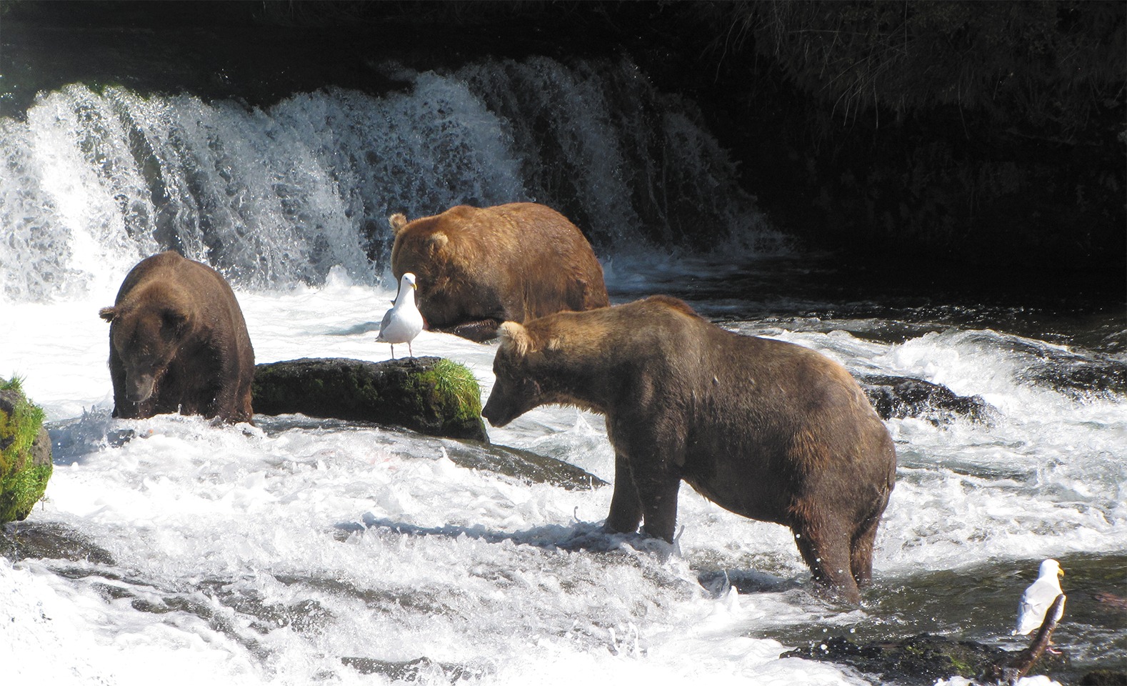 Bears fishing with feathered friends at Brooks Falls in Alaska’s Katmai National Park and Preserve, shared by Mike and Linda Finnerty.
