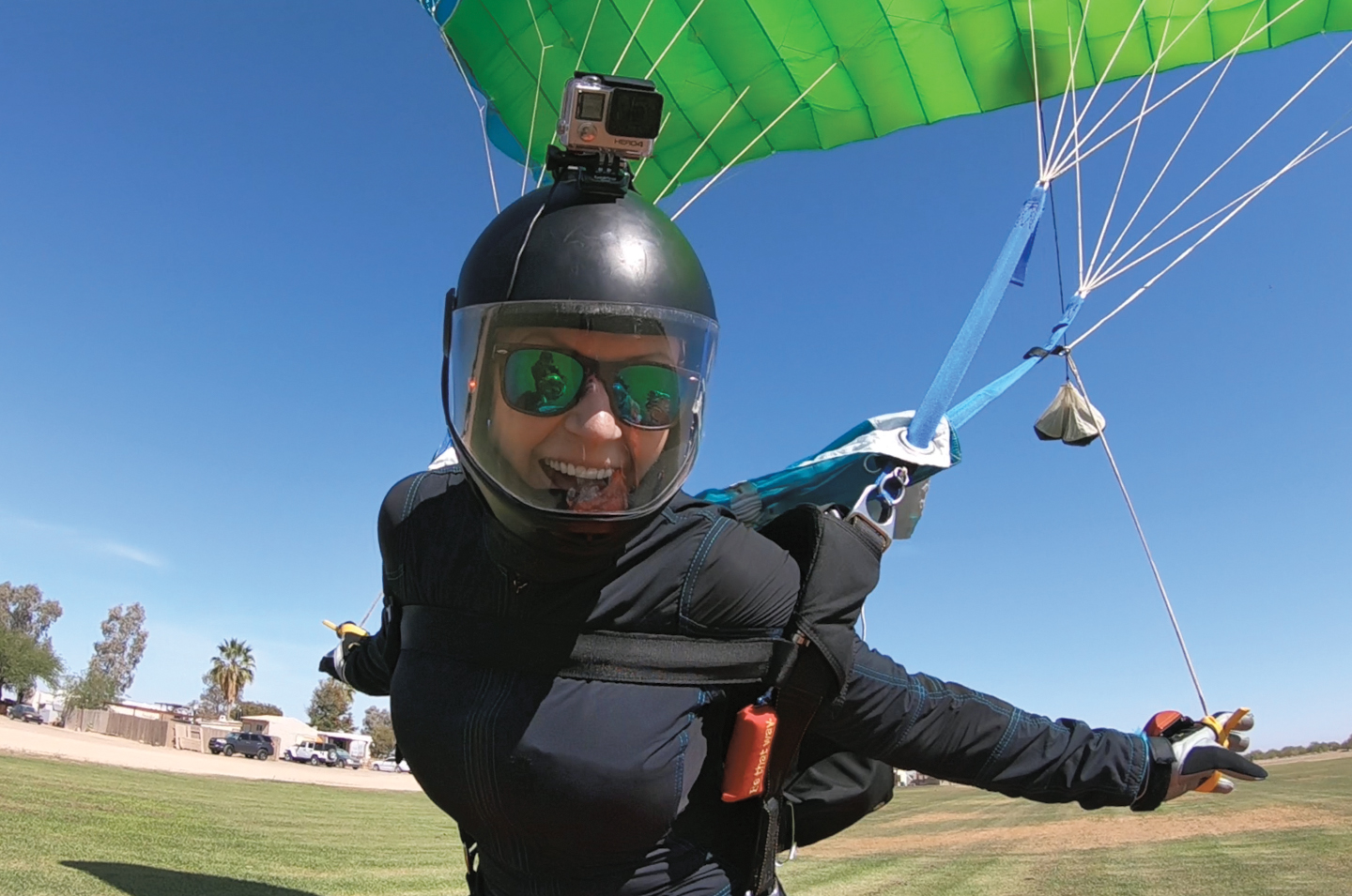 She did, of course. She’s made about 350 BASE jumps and 900 skydives. One close call occurred during a BASE jump in Kuala Lumpur, Malaysia, when her canopy became twisted. She fixed it as best she could, and landed unharmed.