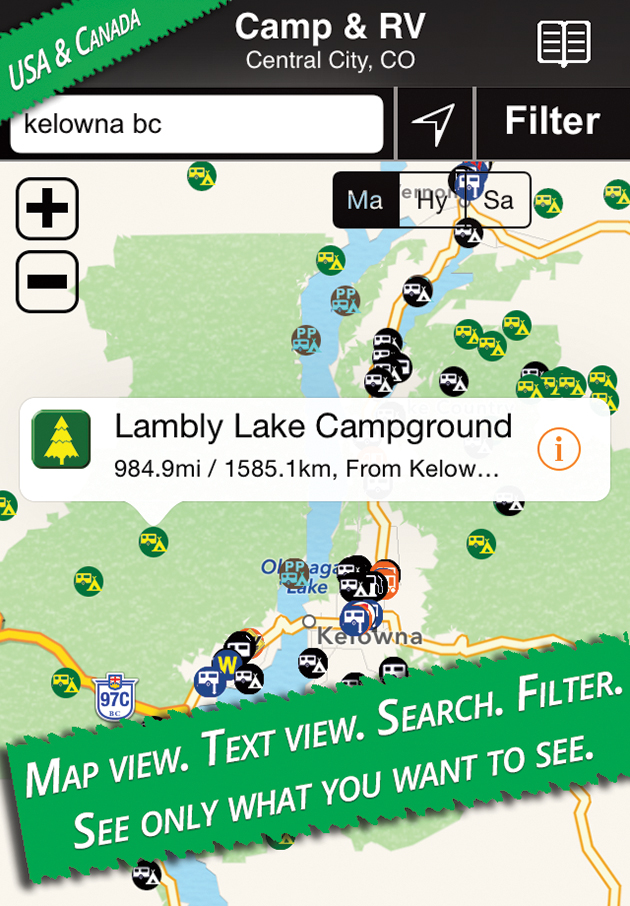 Ultimate Campgrounds: The Ultimate Campground Project, with FMCA members at the helm, includes a website, apps, and point-of-interest lists of more than 38,000 publicly owned camping locations (municipal, state, and national parks; Bureau of Land Management; U.S. Forest Service, etc.). No private/commercial sites are listed. Filters allow the user to refine the search, and filters are remembered for subsequent searches. Favorites can be marked and saved. Info is updated monthly. Available for iOS: $3.99 (U.S. data); $1.99 (Canada data). Mac computers: $3.99 (U.S. data). Android: $3.99 (U.S. and Canada data).