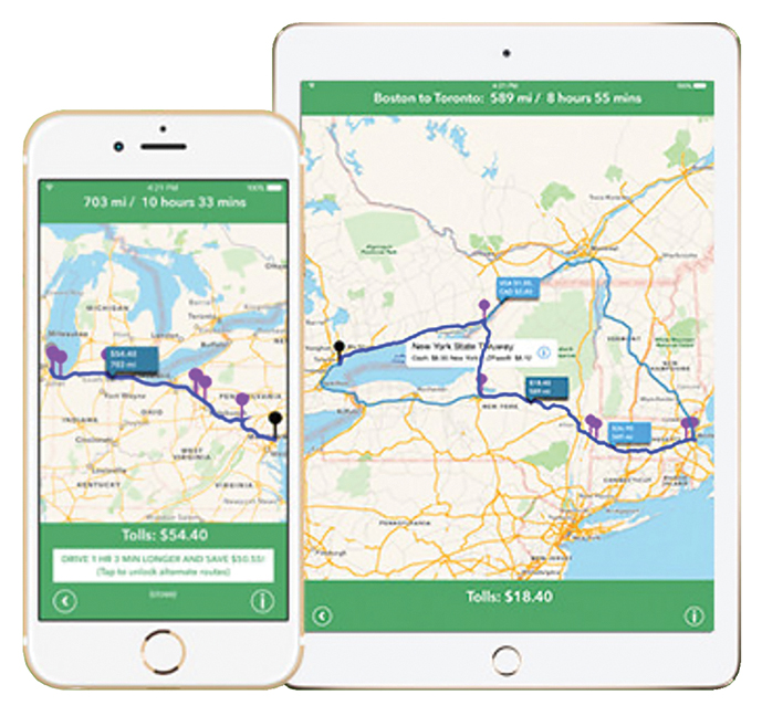 Tollsmart: Calculates toll costs for routes in the United States, Canada, and Mexico. The app factors in transponder discounts from more than 50 tolling agencies. The basic app supports toll fees for two-axle noncommercial vehicles and is free for iOS and Android. An in-app purchase of $3.99 allows you to add a noncommercial vehicle with up to three axles. An in-app purchase of $2.99 allows you to see up to three alternative routes. www.tollsmart.com.