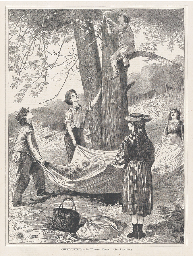 Gathering chestnuts was once a popular pastime, depicted in “Chestnutting,” an 1870 illustration by Winslow Homer.