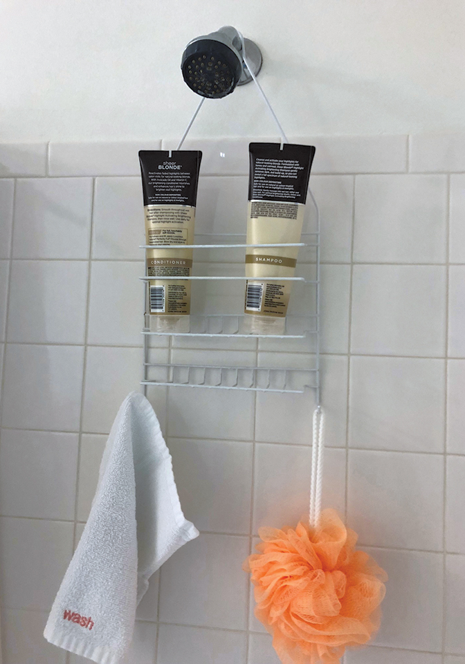 How many times have you gone to the campground shower and discovered there’s no place to put your shampoo and supplies? I purchased a caddy at my local dollar store and carry it in my shower tote. It hangs right on the shower head. Talk about convenience for $1.