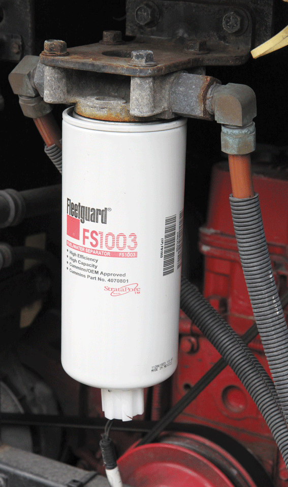 Most diesel engines utilize two stages of fuel filtration. The primary fuel filter performs initial filtration and also serves as a water separator. Many of these filters have sediment bowls or at least a drain petcock on the bottom, as well as a water sensor that communicates with the coach electronics to display a warning on the cockpit’s instrument panel. The petcock can be opened to drain moisture from the filter. Water settles to the bottom, but be sure the engine is stopped and has been allowed to rest for a couple of minutes before draining moisture from the fuel.