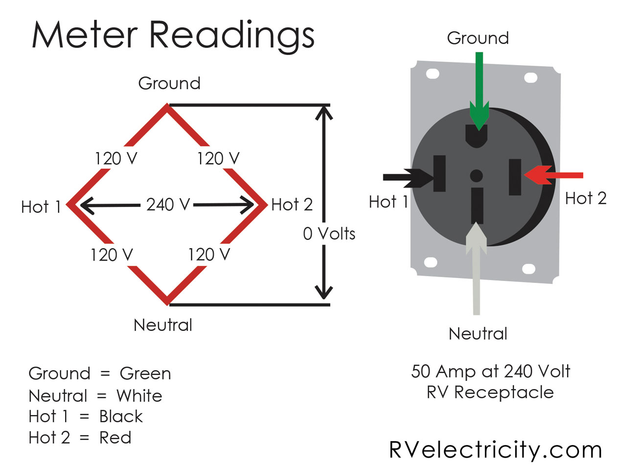 A pedestal with 50-amp service has a four-wire receptacle. In addition to the neutral and ground wires, there are two hot poles. When testing either of the hot poles to the neutral or ground, you should measure 120 volts. When testing one hot pole to the other, you should measure 240 volts.