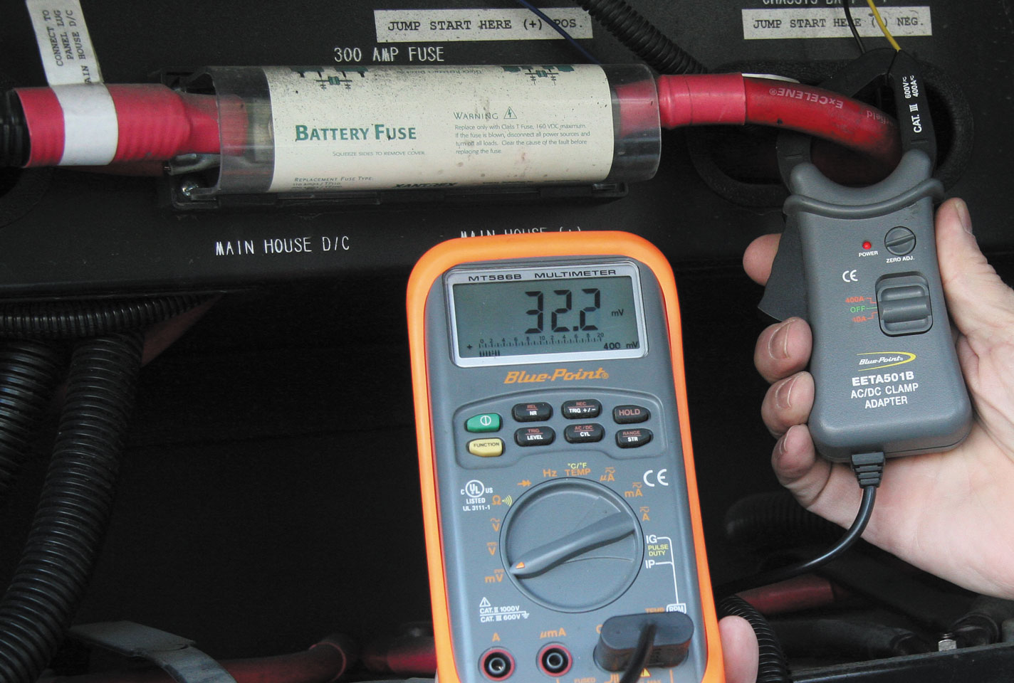 Set the multimeter to the amps position, remove the positive or negative battery cable, and insert the multimeter probes in line between the battery cable and post. If the current draw is significant, remove fuses from the various circuits to determine where the draw is. You then can narrow the search to a handful of components. If you want to check larger current loads, such as alternator output, battery charger output, or inverter draws, you’ll definitely need a clamp-on ammeter attachment.