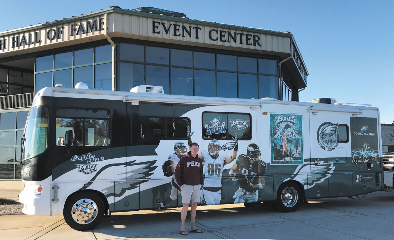 Real estate developer and big-time Eagles fan Patrick Moeller of Long Beach Island, New Jersey, along with his wife and children, have traveled more than 125,000 miles in the Eagle One to home and away Eagles games, making stops at 30 of the 32 NFL stadiums. After the Eagles defeated the New England Patriots in Super Bowl LII on February 4, 2018, Mr. Moeller decided to retire the motorhome.