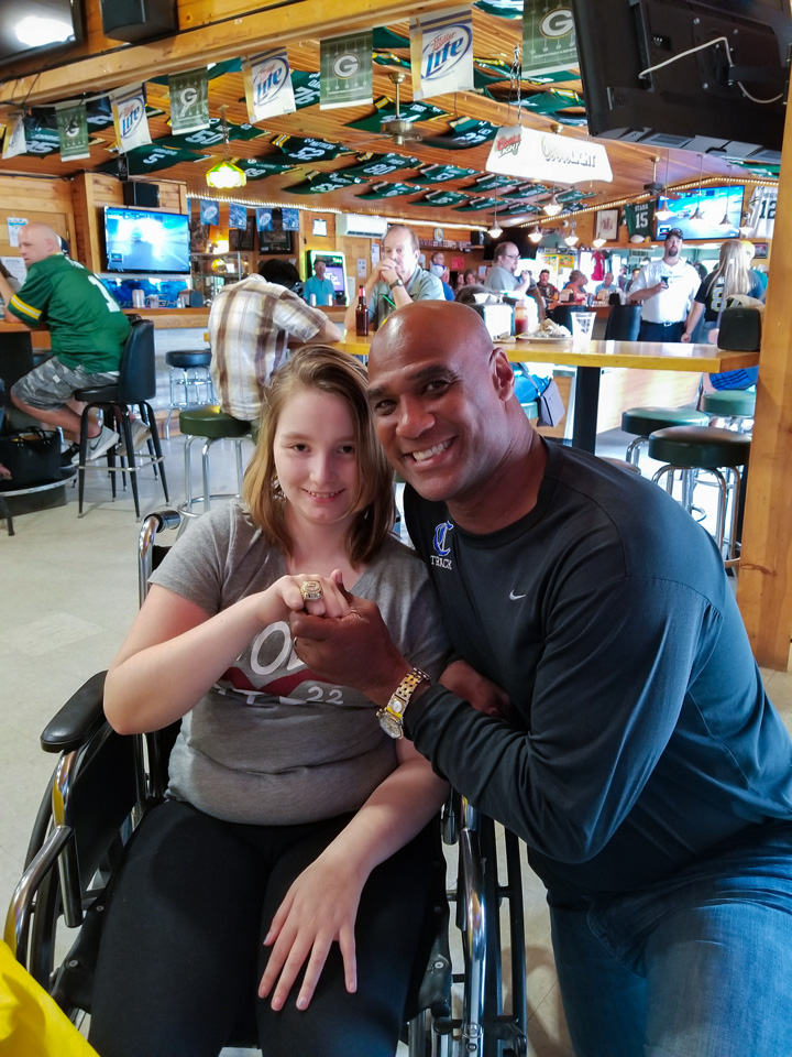 Champions Riverside Resort in Galesville, Wisconsin, regularly hosts fundraising events for the Gilbert Brown Foundation. Here, former Green Bay Packer Eugene Robinson spends time with a young guest.
