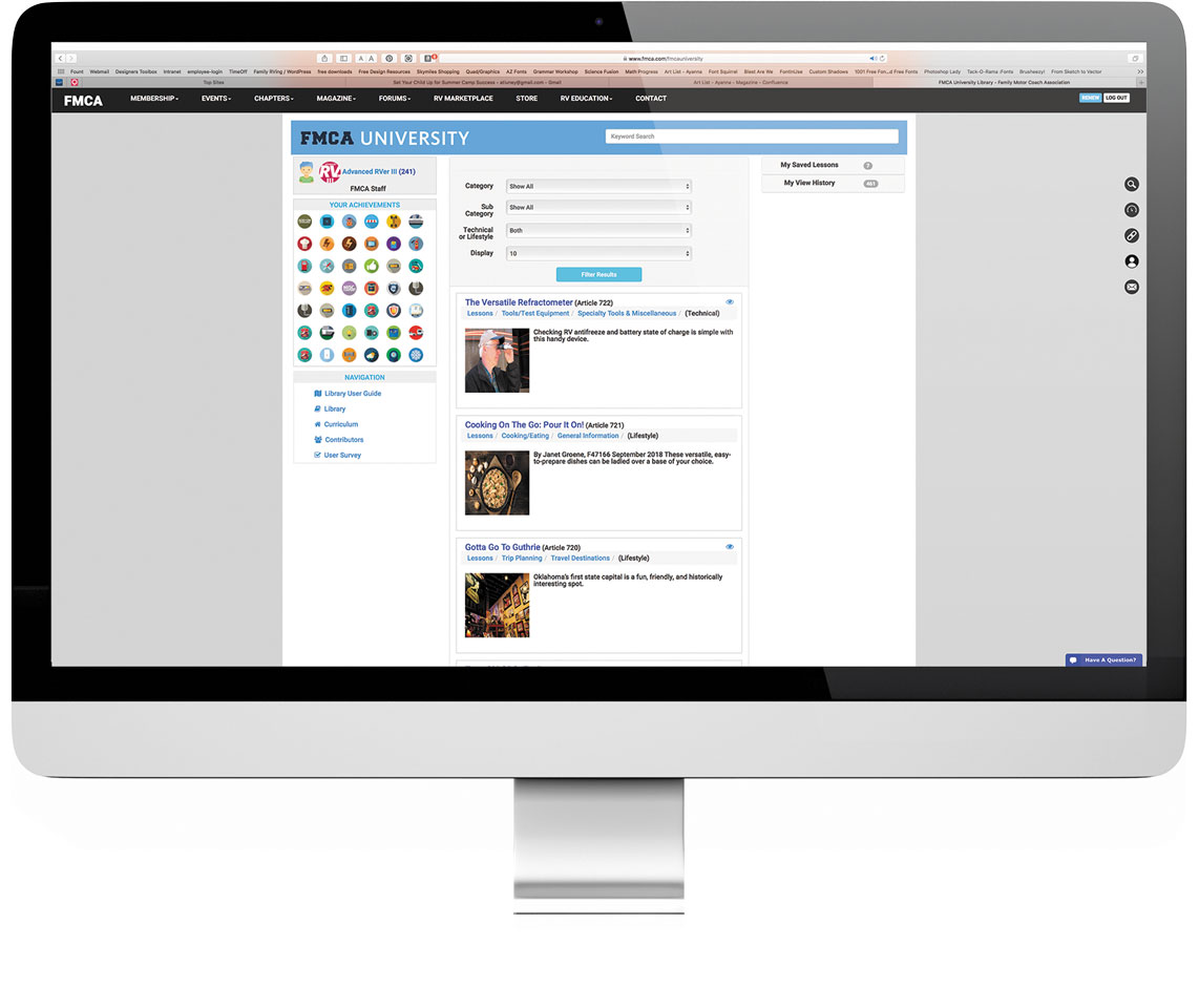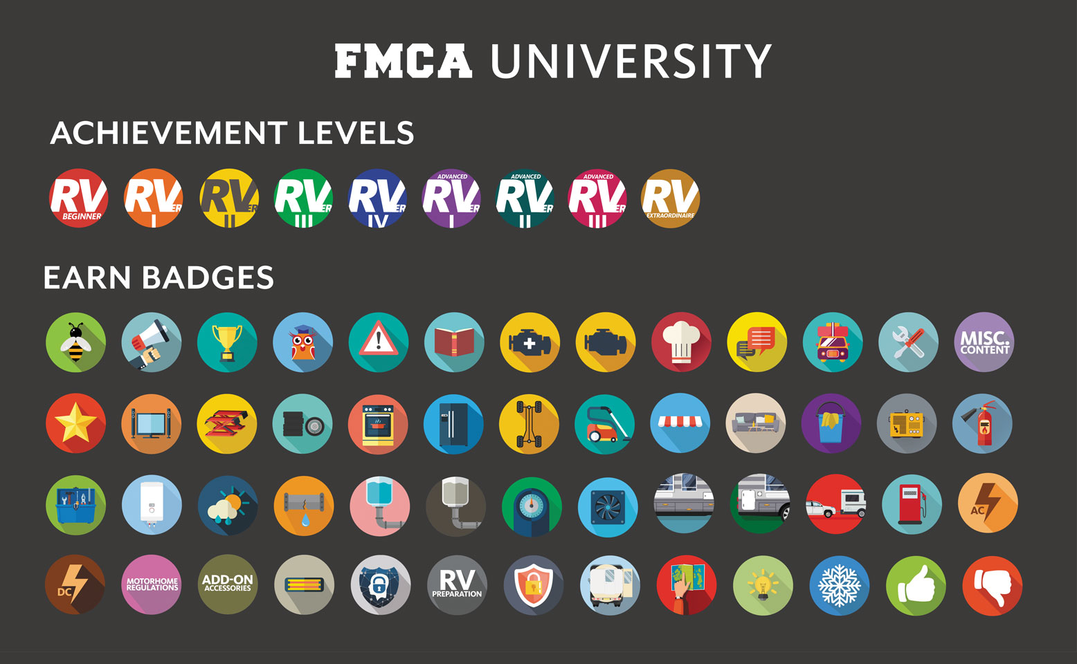 As members take quizzes in the FMCA University Curriculum section at FMCA.com, they can earn badges and move up in achievement level, ultimately leading to a one-time discounted membership renewal.