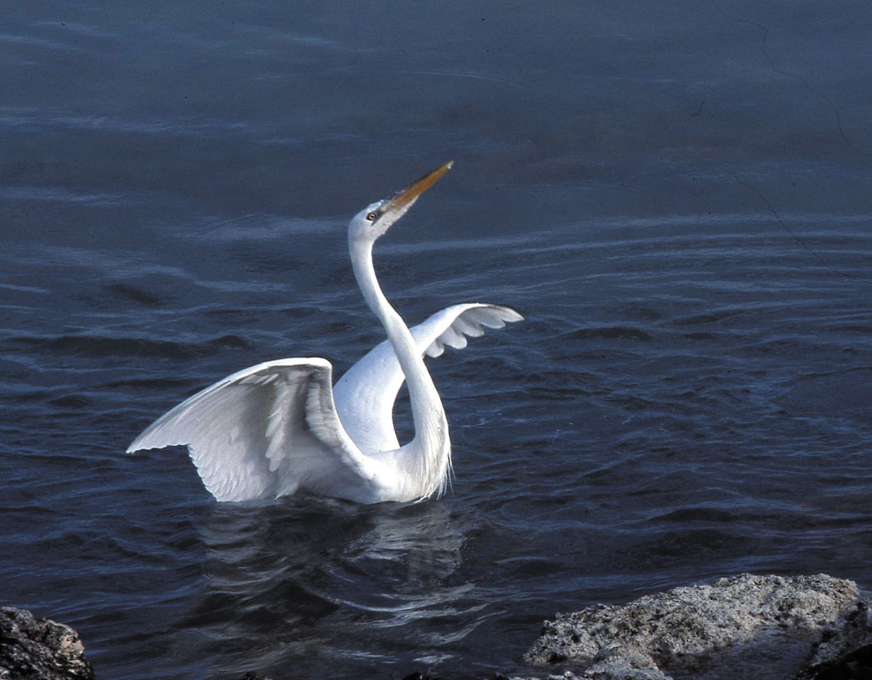 On the third day, I spotted another great white, but it was well camouflaged, and couldn’t be coaxed out for a clear picture. Great white herons have a knack for avoiding notice. If near cover, they will crouch with only their heads peering above the leaves. The shadows of the leaves break up the bird’s outline, making it almost invisible. Film can’t record contrasts in color and shades as vividly as our eye sees them, so a photo of the great white in the bushes was not going to work.