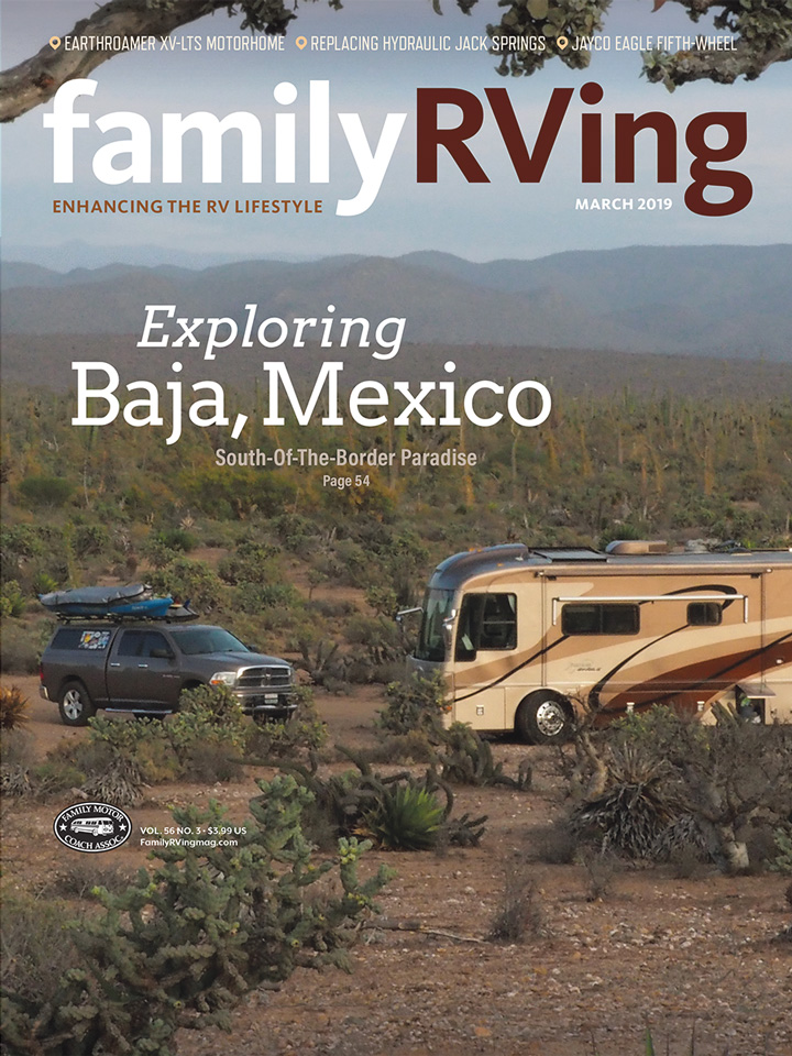 We would love to showcase member-provided photos on the cover of Family RVing magazine, as we did with the Ingrams’ photo taken in Baja, Mexico. The photo needs to include an RV and to meet the following minimum requirements: a resolution of 300 dpi; 1800 pixels by 2700 pixels; photo size 6 inches by 9 inches; vertical format. Generally, photo file size of 14MB or larger. Provide your name, basic information about the photo, and your contact information to editor@fmca.com. If your photo is chosen, we’ll be rewarding the photographer with a check for $250. For a full list of requirements, see page 10 of the March 2019 issue or send a request to editor@fmca.com.