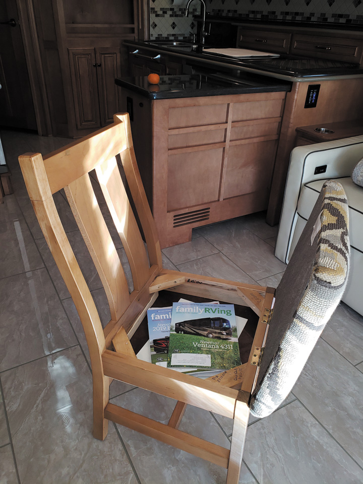 Many RV dinette chairs have at least a 4-inch-deep space under the cushions. If that’s the case, the seats can be modified to make a storage compartment.