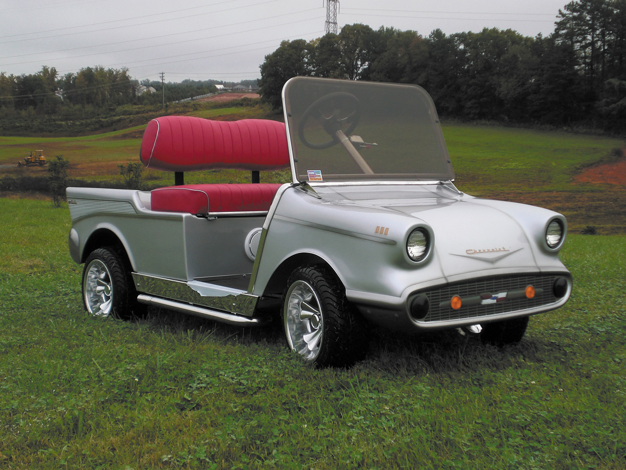A custom golf cart that resembles a ’57 Chevy (top) is among the many creations of FMCA member Larry Deese.